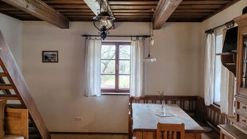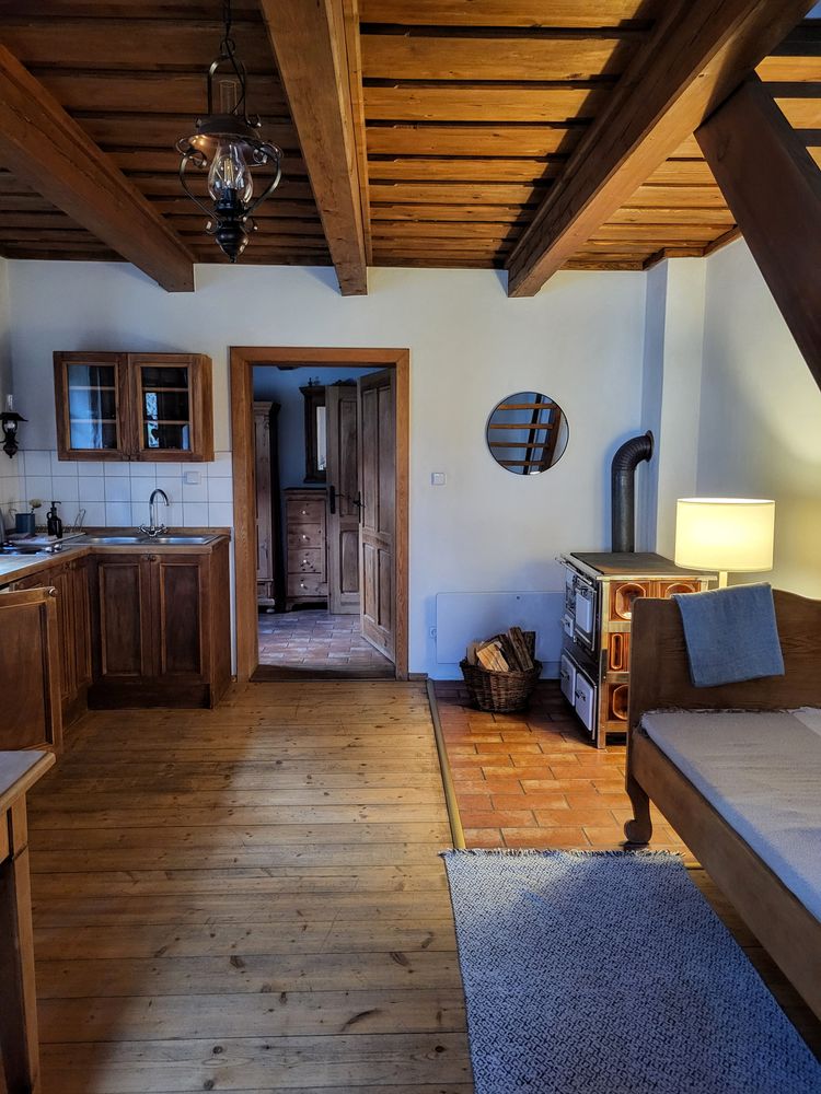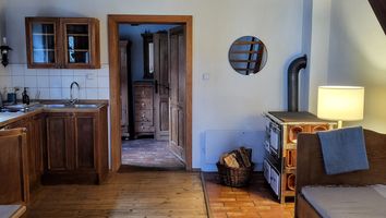 - Útulná kuchyně se sedací soupravou, kachlovým sporákem a nádobím (30 m2)